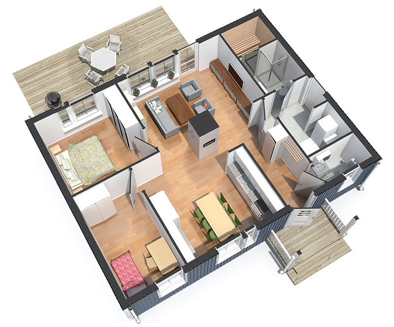 В базовую комплектацию входит: свайно-винтовой фундамент, домокомплект зимнего дома с толщиной стены 182 мм (имитация бруса 20 мм + минеральная вата 150 мм + вагонка 12 мм), утепленный пол, утепленная крыша, окна (двойной стеклопакет), деревянные межкомнатные двери, входная металлическая дверь, покрытие крыши кровельным материалом (ондулин), монтаж дома.