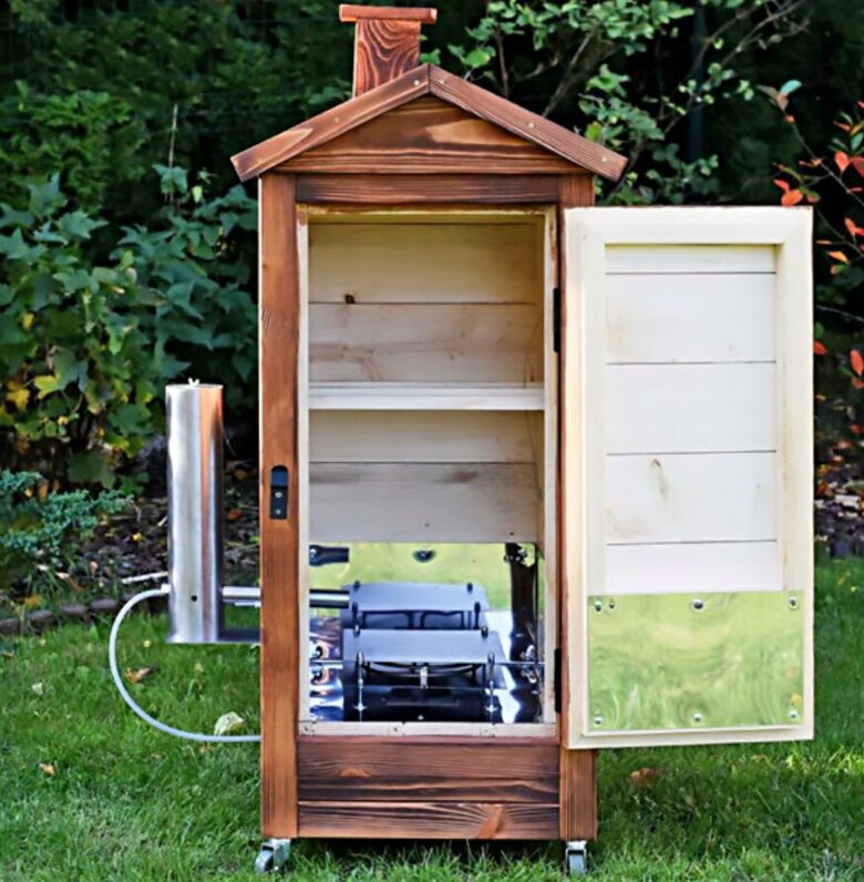 Преимуществом коптильни является ее мобильность, малый вес и компактные размеры. Кроме того, коптильня оборудована колесами для облегчения перемещения по саду.